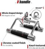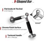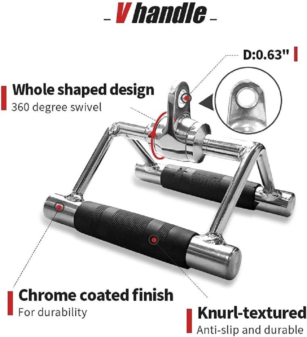 - 【V Shaped Bar & V Handle with Rotation】 Constructed of high-quality solid steel with polished chrome finish. 0.6 inch hole can fit easily for all cable system. Textured rubber coating handle,provides ergonomic & secured grip during workout, provides a balanced force to both arms when attach it to any gym machine.