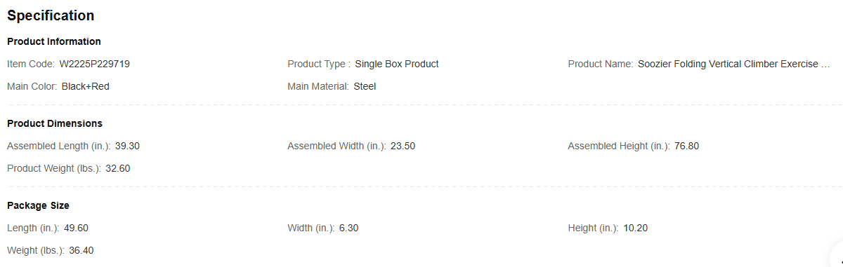- Climber Machine Information: Overall Dimensions: 39.25″ L x 23.5″ W x 69″ -76.75″ H. Foldable Dimensions: 39.25″ L x 11.75″ W x 69″ H. Weight Capacity: 220 lbs.